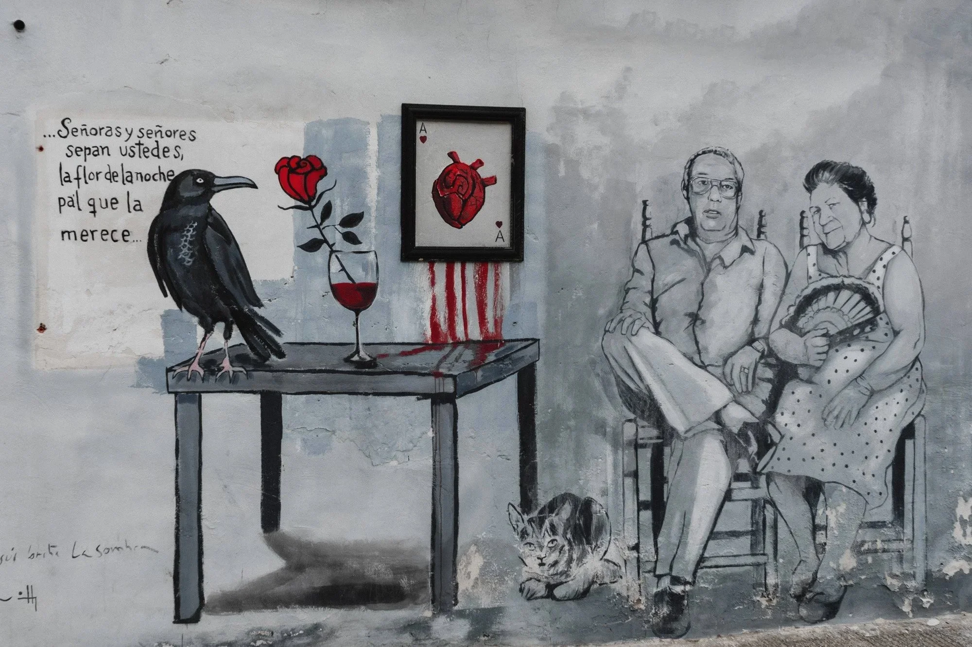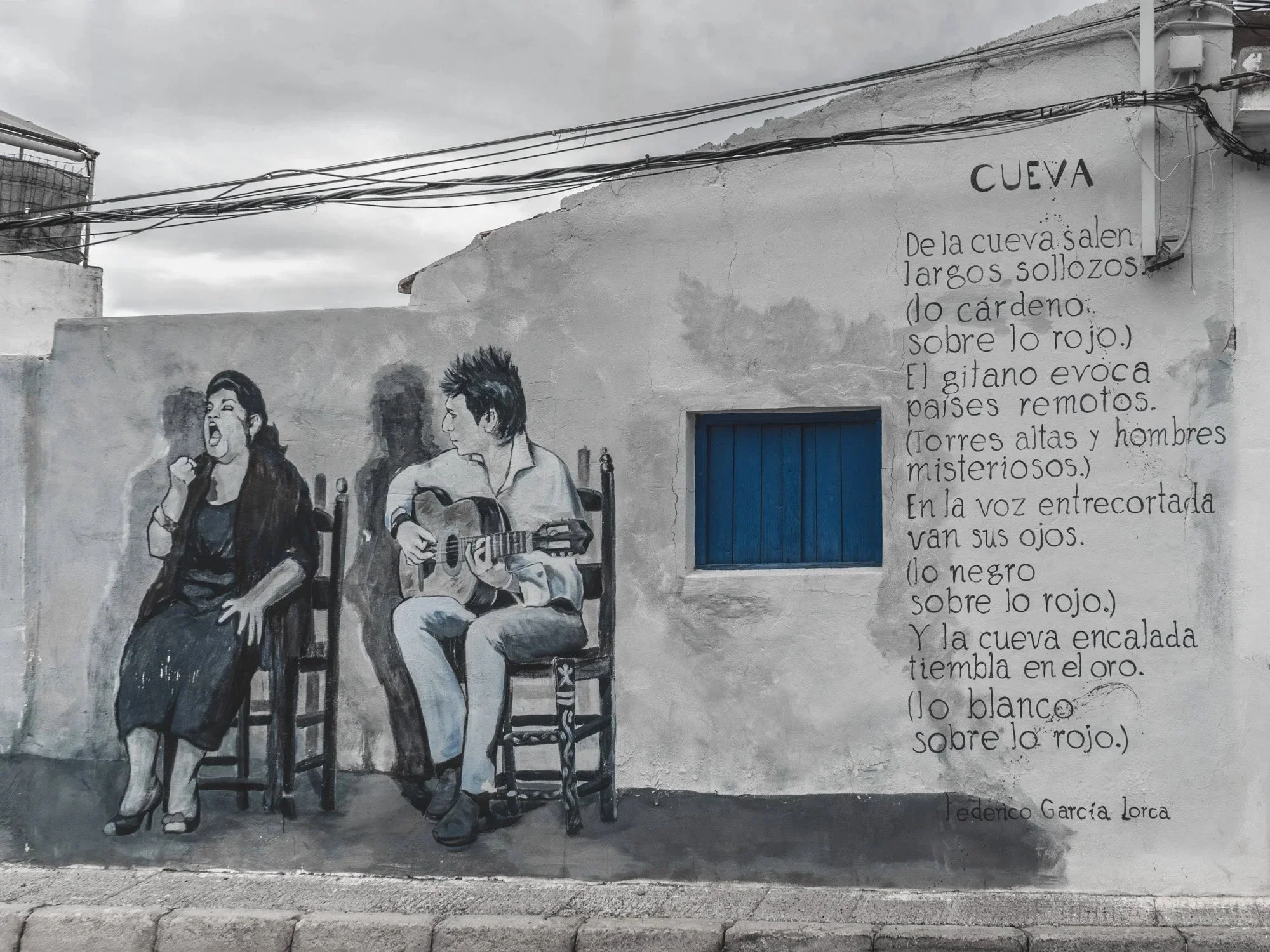 En el callejón hay murales que rinden homenaje al flamenco y al pueblo gitano, o más bien al pueblo romaní. Ellos se llaman a sí mismos gitanos, pero no estoy seguro de si puedo usar ese término.