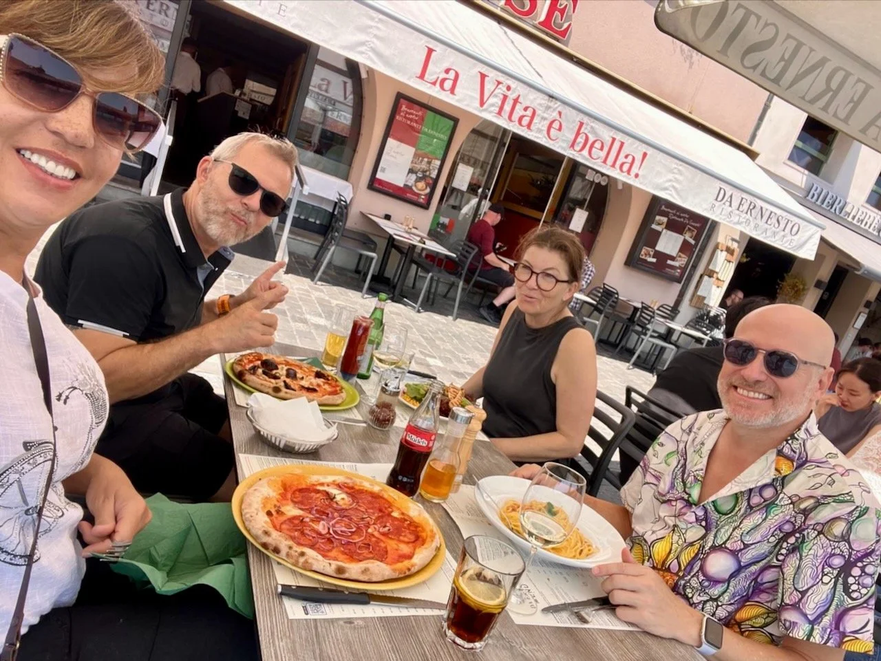 Esa noche disfrutamos de una cena, ¡con nuestros amigos! Elizabeth y Kevin están a la derecha y Tami y Rodney están a la izquierda.